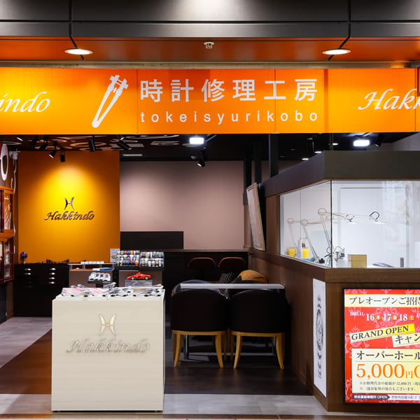 ⑨通路右手に「時計修理工房」の店舗がございます。オレンジの吊り看板が目印です。