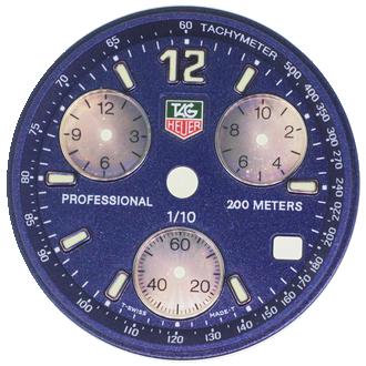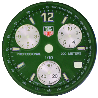 タグホイヤーの文字盤を、ご希望の緑色へ書き換えいたしました。変色してしまっていたクロノグラフ部分のシルバー色も、元のお色に近づけて再生いたしました。