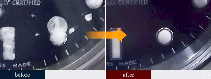 以下の写真は、文字盤が水でふやけ、夜光塗料が溶けてしまった状態から、文字盤を再生修理したことで美しさを取り戻した例です。