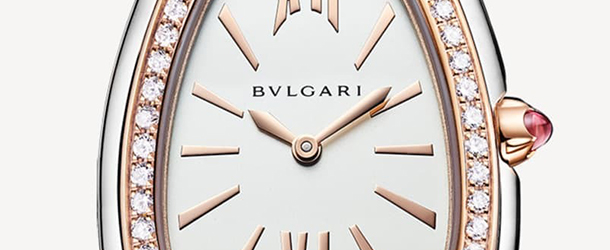 ブルガリの腕時計は、同じ宝飾ブランドのカルティエと同様、リューズの部分が宝石で装飾されているモデルが多いのが特徴です。「セルペンティ」「ルチェア」など多くのモデルで、ルベライトをあしらった美しいリューズが使われています。