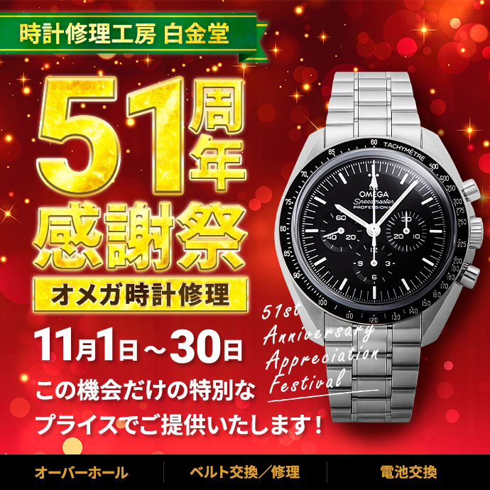 時計修理工房を運営する白金堂は、おかげさまで創業50周年を迎えます。技術力やサービスの優れた時計修理店は当店の他にも数多くありますが、50年という年月の歩みと、積み重ねてきた千万のお客様との信頼関係は、決して一朝一夕に築くことのできない私たちならではの強みと自負しております。