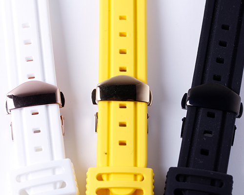 ウレタンやシリコンラバーなどの合成樹脂を用いて作られた時計ベルトです。ファブリックと同様にカジュアルでスポーティーなシーン向けで、樹脂ならではの弾力性やなじみやすさが特徴。丈夫でお手入れもしやすく、革やメタルより見栄えは劣りますが実用性は非常に優れています。