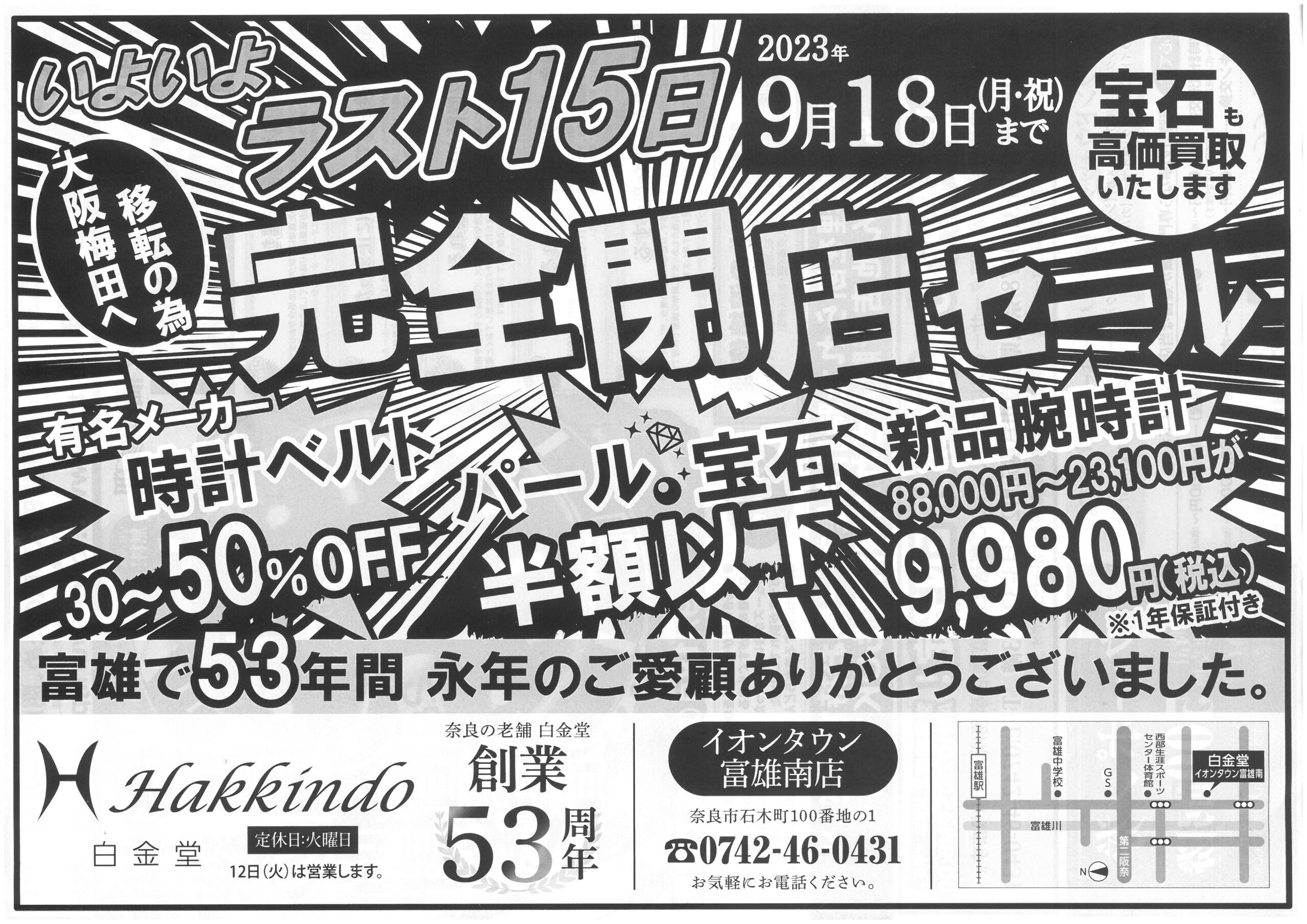 2023年9月3日(日)~18日(祝)まで、「完全閉店セール」を開催いたします。