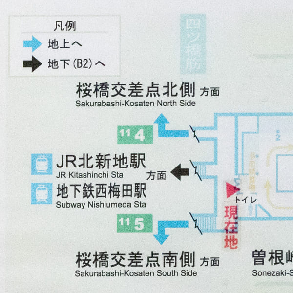 ①「JR北新地駅」「地下鉄西梅田駅」方面の出口へ向かってください。