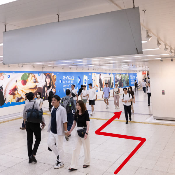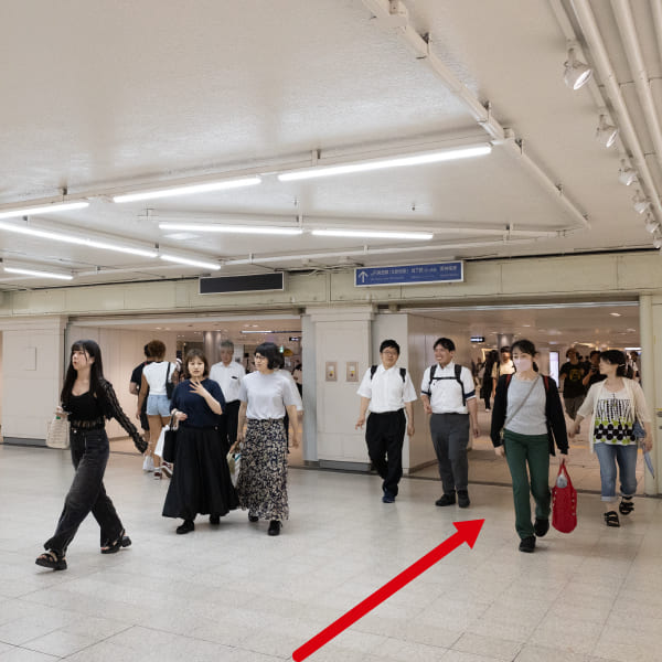 ⑤頭上看板「地下鉄東西線<北新地駅> 地下鉄(四つ橋線) 阪神電車」の下を通過します。