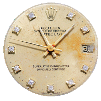ロレックスの文字盤です。地盤まで錆びついておりましたので一から作って交換致しました。