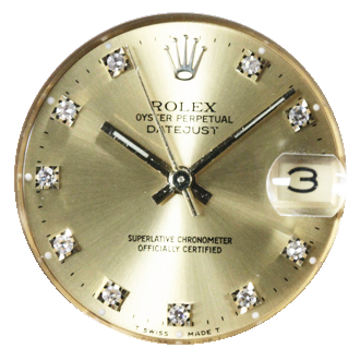 ロレックスの文字盤です。シャンパンゴールドから白に色を塗り替え、インデックスにダイヤを付けました。