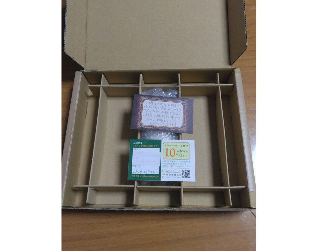 この度は、弊社にお時計をお送り頂き誠にありがとうございました。 仕上がりにもご満足頂けましたようで幸いでございます。お褒めのお言葉も頂き、重ねてお礼申し上げます。 またのご利用をお待ちいたしております。