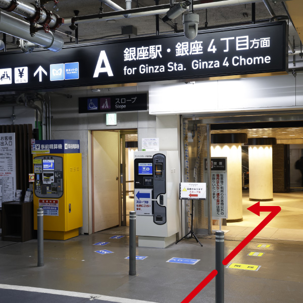 ①出口「A」銀座駅・銀座4丁目方面を出て、銀座駅地下通路を左折。