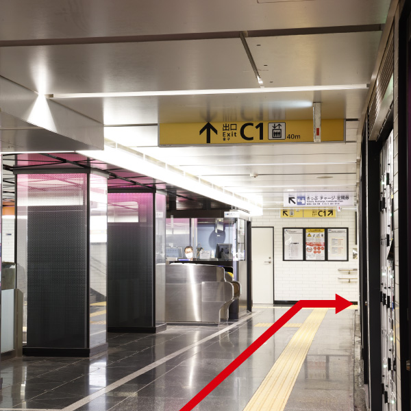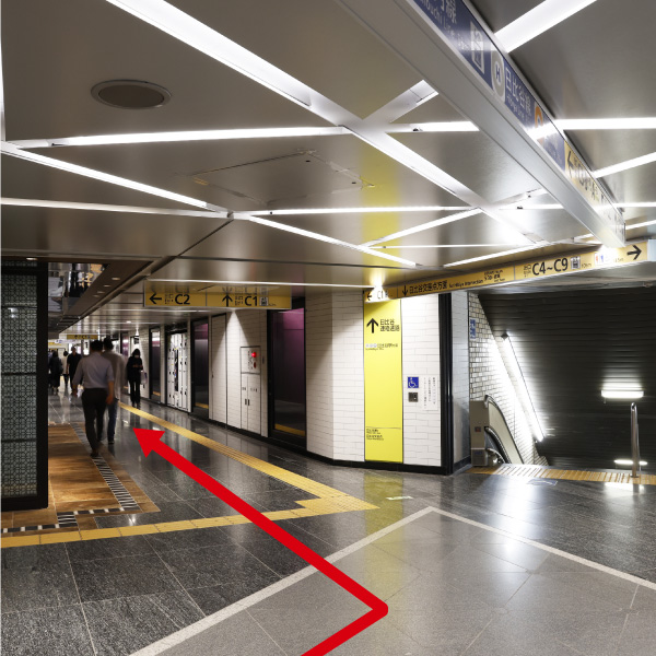 ④階段を上がったら出口「C1」に向かって通路を左折。前には地下鉄銀座駅の改札があります。